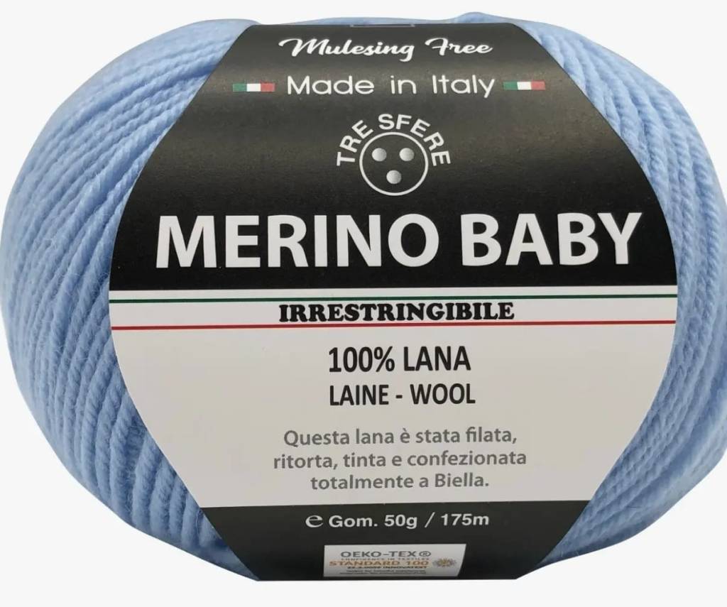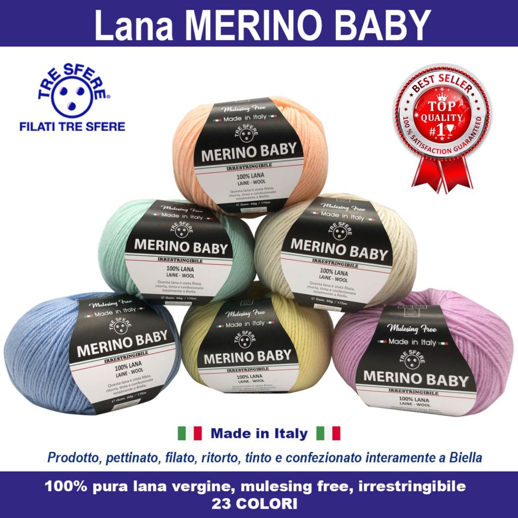 Lana merino baby soffice e leggera, 100% pura lana vergine, mulesing free, irrestringibile, certificata oeko-tex®, cf. 10 gomitoli da 50gr 175 metri, ferri 3-3,5, made in italy, prodotto pettinato filato ritorto tinto e confezionato interamente a Biella, peso garantito,